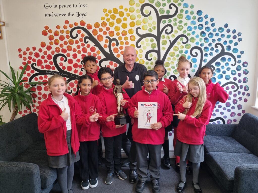 Enthusiastic pupils at Sneinton St Stephens Primary School on Windmill Lane were presented with a copy of Go Bendy Go – The Boy Who Liked To Box and all pupils were told about their local hero in their school assembly.